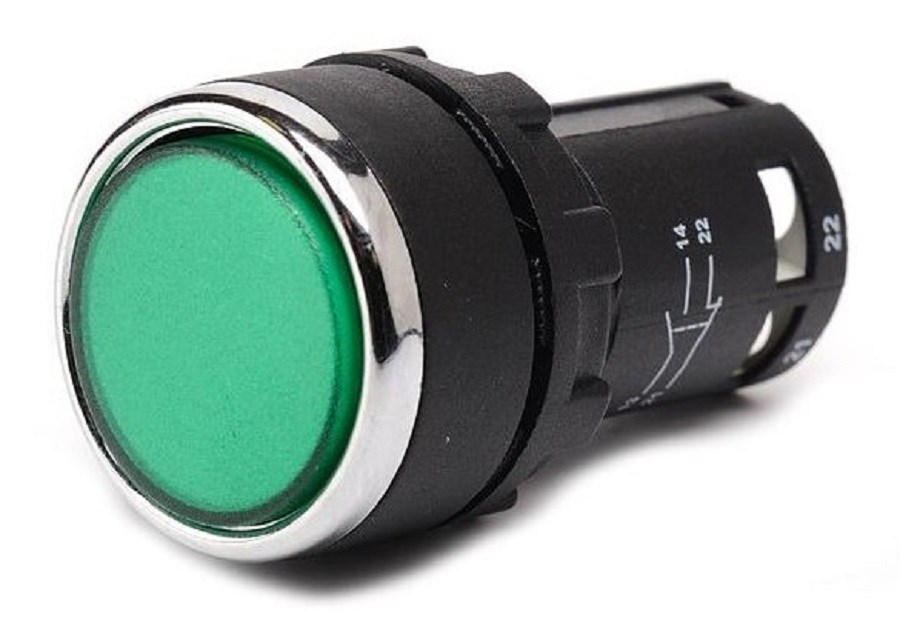 Нажимная моноблочная кнопка EMAS зеленая 22 мм, IP 40 (1НО+1НЗ) MB102DY