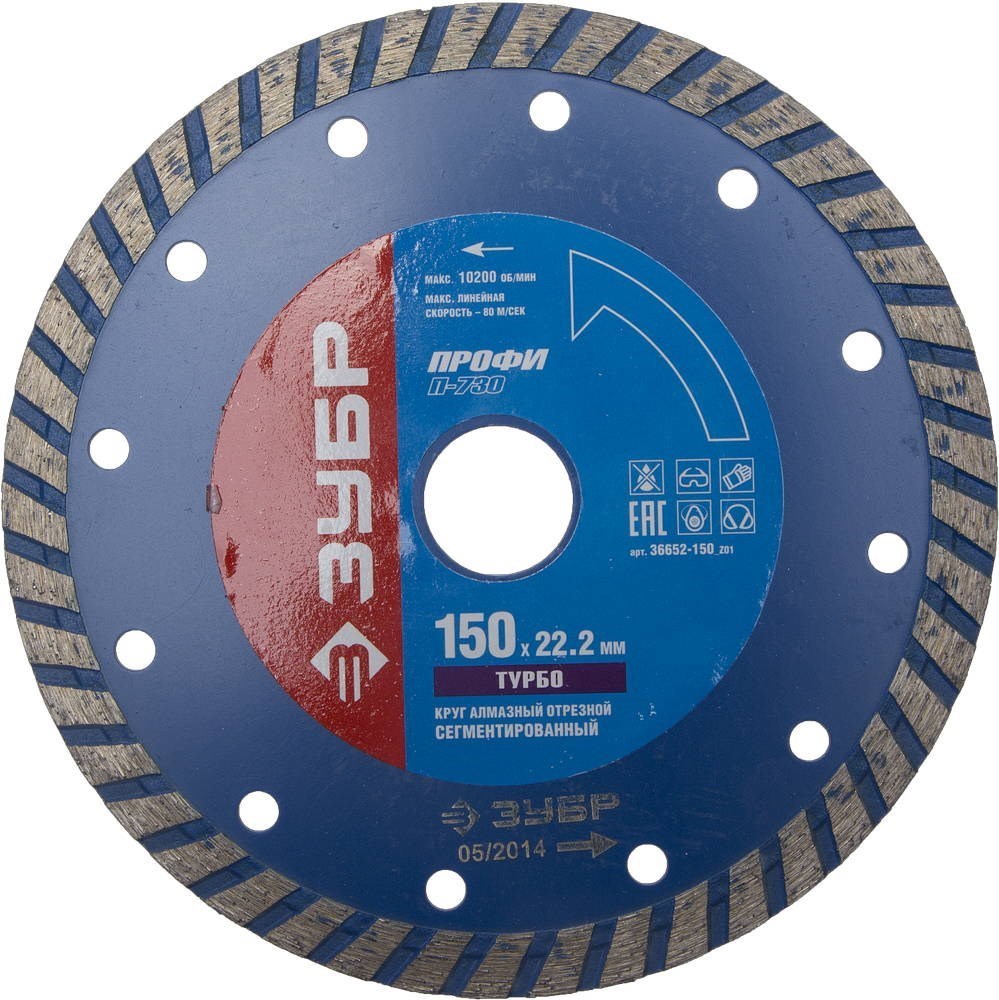 Отрезеной диск Зубр, алмазный, сегментный, 22,2х105мм 36652-105_z01 применяется в угловой шлифовальной машине для резки (сухой и с применением охлаждающей жидкости): бетона, гранита, кирпича, камня, мрамора, других строительных материалов. Время непрерывной работы не должно превышать 60–90 с, после чего необходимо охлаждать диск на холостом ходу не менее 20 с. Направление вращения должно строго соответствовать направлению стрелки. Запрещается использовать диск для резки и шлифовки металлов. В случае засаливания диска можно восстановить его режущую способность, выполнив серию резов по однородному абразивному материалу. Оригинальная форма режущей кромки с компенсационными отверстиями по всей окружности. Эффективная работа без принудительного охлаждения алмазного слоя.