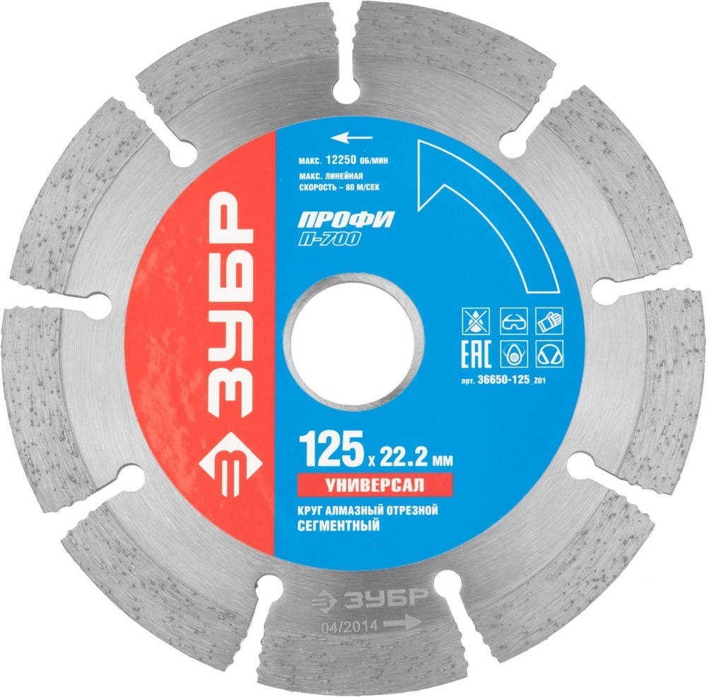 Отрезеной диск Зубр, алмазный, сегментный, 22,2х125мм 36650-125_z01 применяется в угловой шлифовальной машине для резки (сухой и с применением охлаждающей жидкости): бетона, гранита, кирпича, камня, мрамора, других строительных материалов. Время непрерывной работы не должно превышать 60–90 с, после чего необходимо охлаждать диск на холостом ходу не менее 20 с. Направление вращения должно строго соответствовать направлению стрелки.  Запрещается использовать диск для резки и шлифовки металлов. В случае засаливания диска можно восстановить его режущую способность, выполнив серию резов по однородному абразивному материалу. Оригинальная форма режущей кромки с компенсационными отверстиями по всей окружности. Эффективная работа без принудительного охлаждения алмазного слоя.