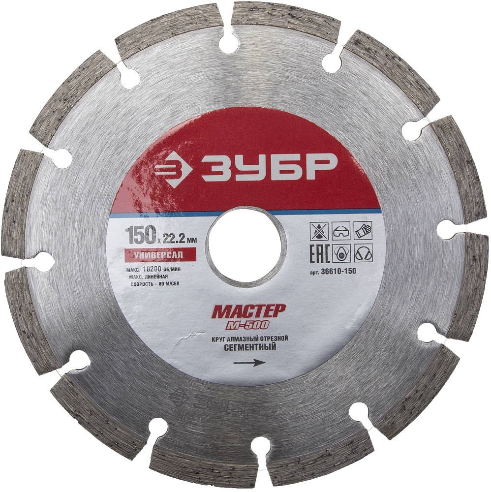Отрезной диск Зубр "Мастер" алмазный, сегментный, 22,2х150мм 36610-150 имеет исключительно высокий уровень качества гарантирован комплексной системой контроля всего производственного процесса. Применяется на углошлифовальных машинах для резки: бетона,  бордюрного камня, облицовочного кирпича, декоративной брусчатки, тротуарной плитки. Особая сегментная форма режущей кромки позволяет быстро и эффективно осуществлять резы в литых и прессованных абразивных материалах. Длительный срок службы.  Воздушное охлаждение.